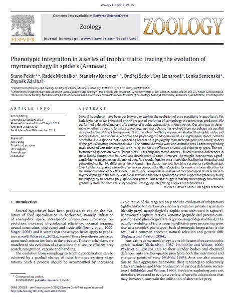 Pekár S., Michalko R., Korenko S., Šedo O., Líznarová E., Sentenská L. & Zdráhal Z. (2013): Phenotypic integration in a series of trophic traits: tracing evolution of myrmecophagy in spiders (Araneae). Zoology 116 (1): 27–35. DOI: 10.1016/j.zool.2012.05.006.