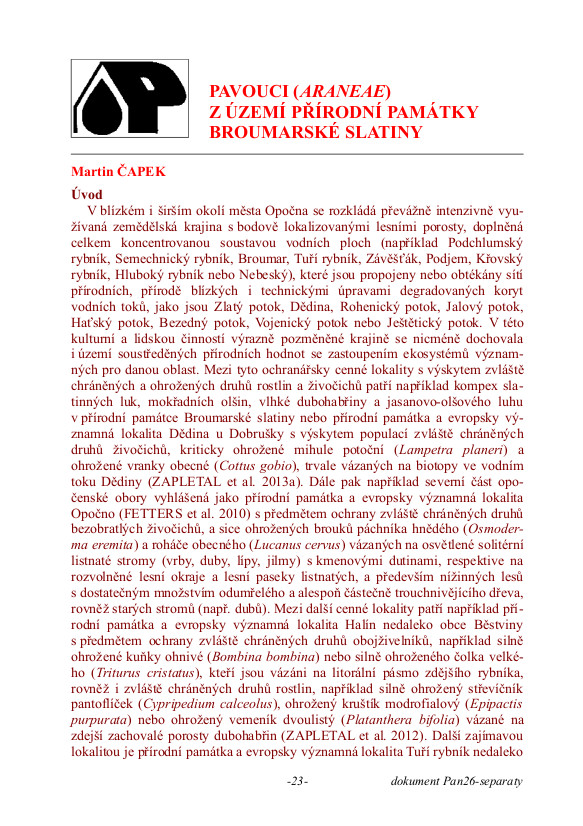 Arachnologický průzkum na Mostecku a Chomutovsku byl doposud soustředěn zejména na Krušné hory (BUCHAR a HAJER 1999, 2005, 2010. ROUŠAR 2011. RŮŽIČKA a HAJER 2002, 2003), jednotlivé sběry z okolí jsou také zahrnuty v katalogu pavouků ČR (BUCHAR a RŮŽIČKA 2002), na Chomutovsku je známo také několik publikovaných sběrů Antonína Roušara (ROUŠAR 2009, 2015, 2016). Přesto údaje o výskytu pavouků z mnoha lokalit scházejí. Proto od 1. do 4. června 2017 uspořádalo Oblastní muzeum v Mostě arachnologické exkurze do nejbližšího okolí Mostu a Chomutova, kterých se zúčastnili členové České arachnologické společnosti. Jako cílové byly zvoleny lokality, na kterých se systematicky pavoukovci dosud nesbírali, ale i lokality, které by vzhledem ke svým přírodním hodnotám mohly být v budoucnu zařazeny mezi zvláště chráněná území. Tento článek předkládá seznam všech druhů pavouků, kteří byli během akce zjištěni.